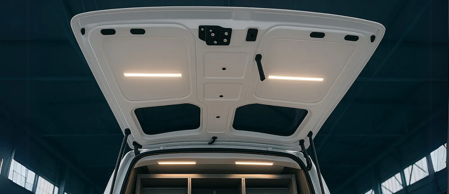 Für ein spezielles Behördenfahrzeug der Feuerwehr haben wir eine einteilige Heckklappe aus glasfaserverstärktem Kunststoff (GFK) entwickelt und gefertigt. Während das Serienfahrzeug ursprünglich mit einer zweiflügeligen Hecktür ausgestattet ist, wünschte sich der Endnutzer – die Feuerwehr – eine praxisnähere Lösung für Einsätze mit medizinischer Versorgung am Unfallort.