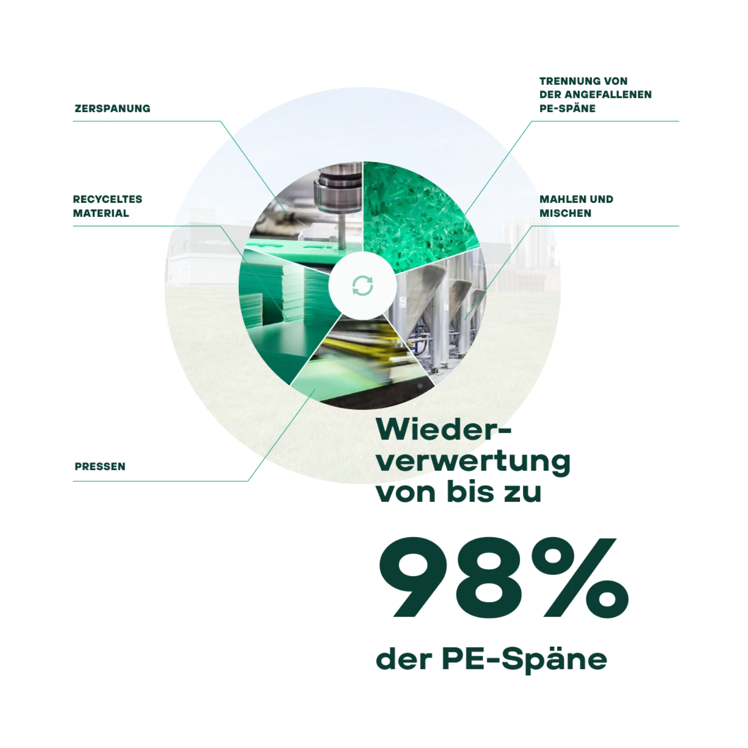 Die im Fertigungsprozess anfallenden Späne und Stückreste unserer Werkstoffe werden sortenrein gesammelt und für die Herstellung von Regeneraten wiederverwendet. Dadurch vermeiden wir Abfall und senken den Verbrauch von Rohstoffen.