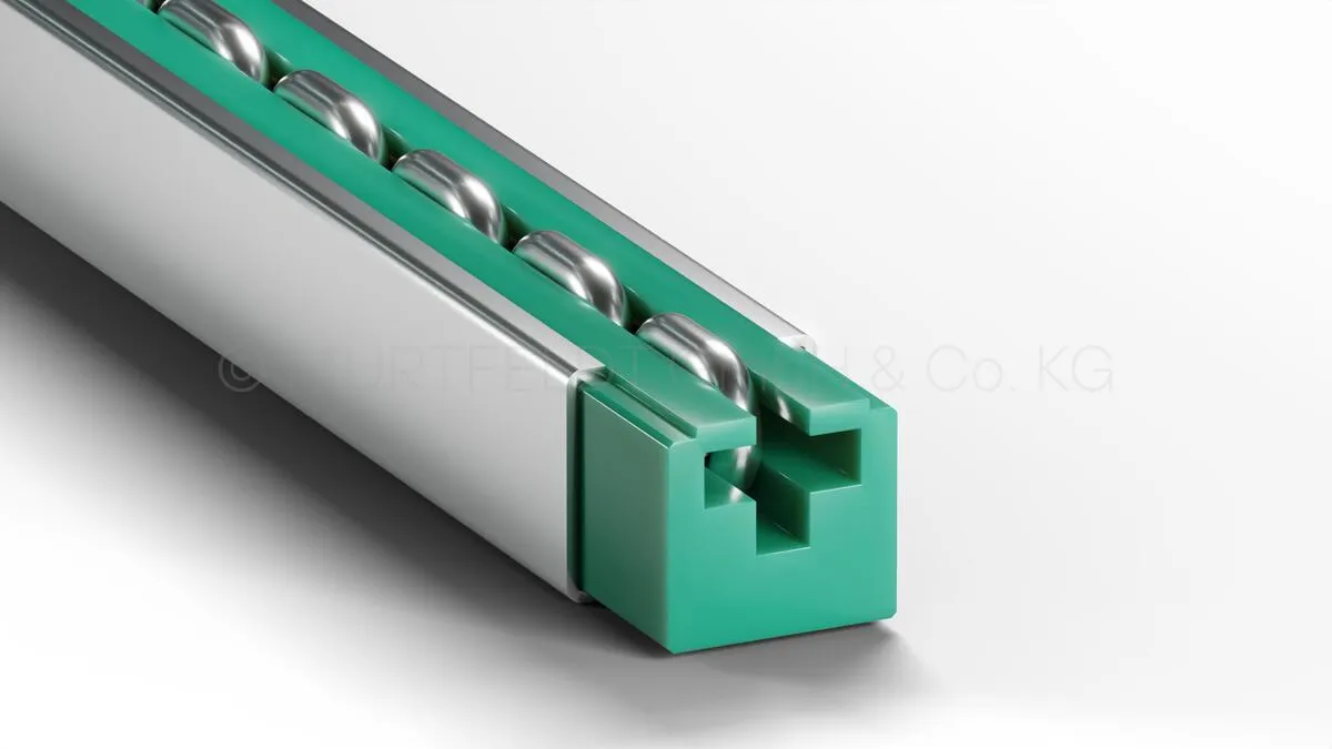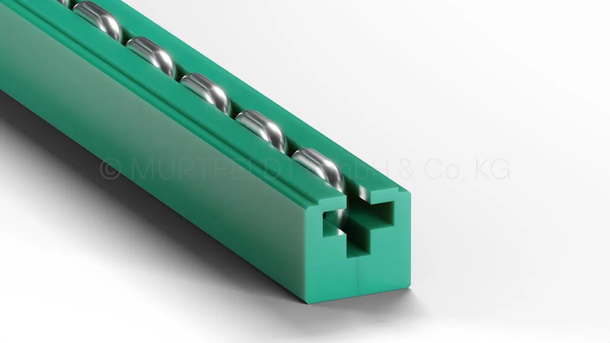 The sealed chain guide rail Type CRG for round steel chains stands out due to its precise tolerances, both in the plastic profile cross-section and in length tolerance, ensuring a perfect fit and smooth operation. The optionally available steel profile almost completely encloses the chain guide rail, providing additional stability and protection, which is particularly advantageous in high-frequency applications.