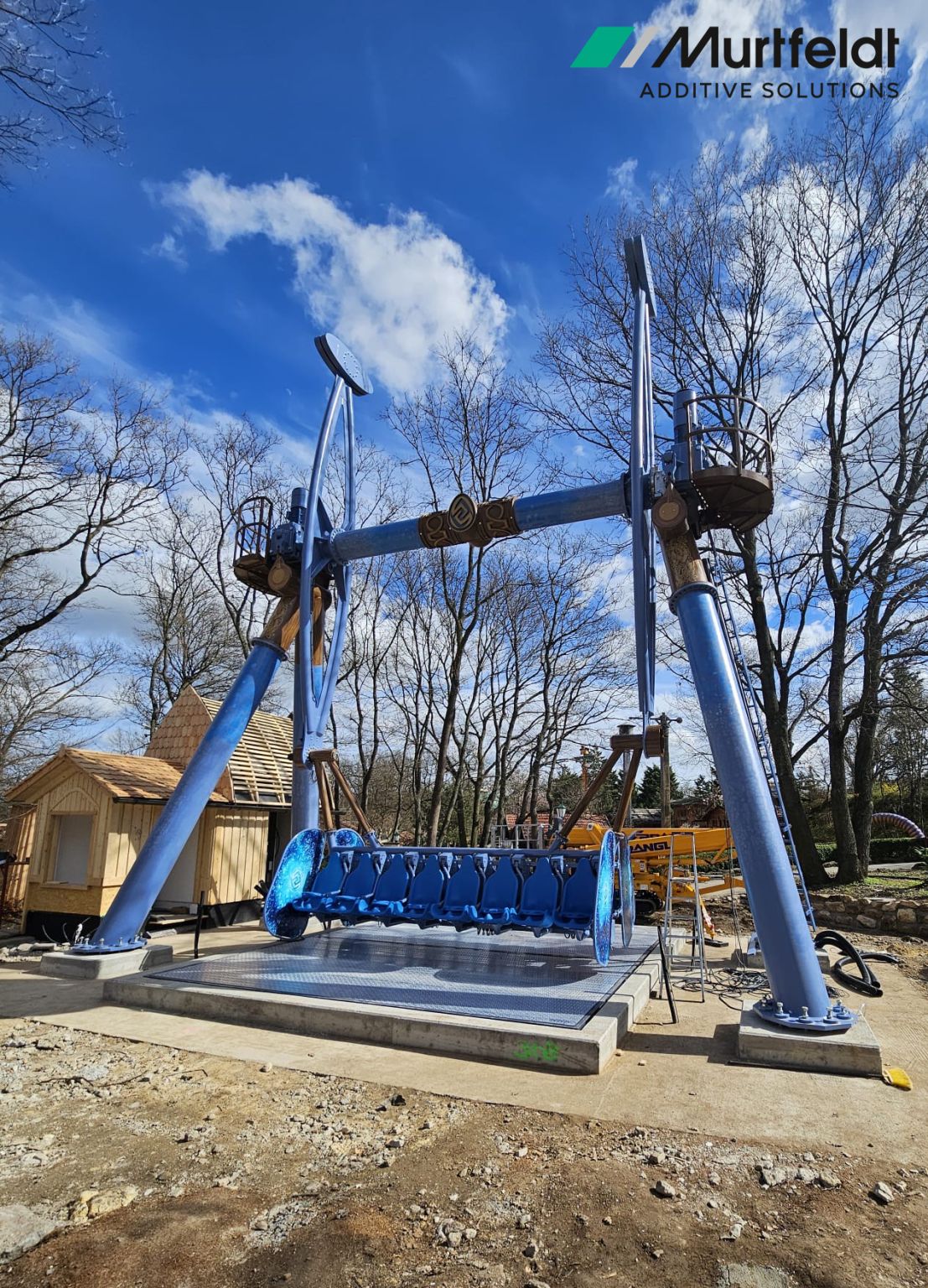 Our innovative additive manufacturing enables the production of large-format plastic components with maximum efficiency. A recent example: the 170 cm wide crossbeam of a giant swing in a family amusement park. Thanks to our VFGF process, in which parts are built up layer by layer from the bottom up using a nozzle with a variable diameter, and the large-volume build space, we were able to achieve fast, cost-effective, and precise production. After post-processing and painting, the component is now ready for use – for boundless ride enjoyment!