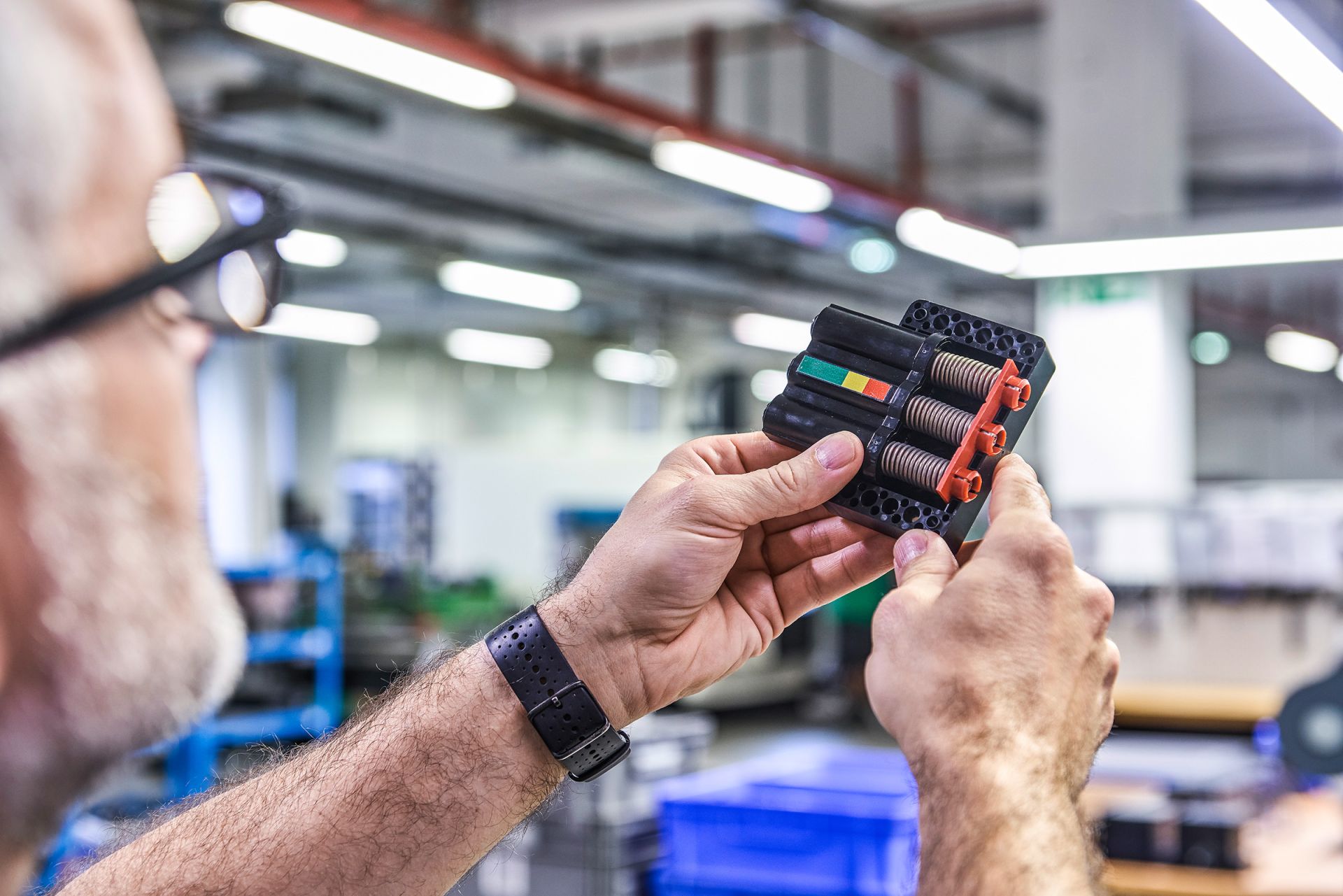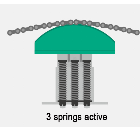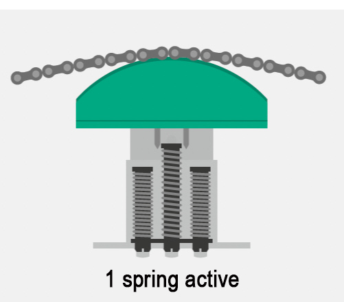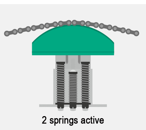 Our tensioning systems are particularly gentle on chains thanks to the freely oscillating spring principle, which prevents excessive surface pressure. The tension force can be optimally adjusted using up to three freely selectable springs. Once the entire adjustment range has been used, the chain must be shortened or replaced with a new one.