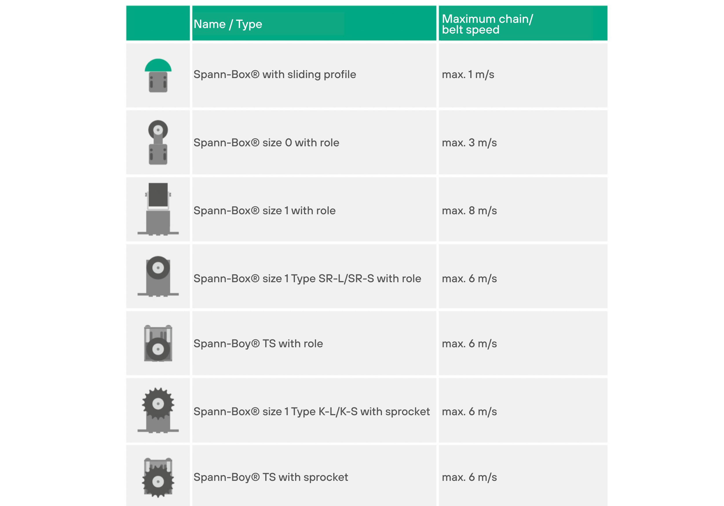 The maximum possible speeds depend heavily on the duty cycle. For a high duty cycle, the following applies: up to 1 m/s for standard sliding profiles made from Original "S"® green. For higher speeds, Spann-Box® types with sprockets or sliding profiles made from high-performance materials are available (up to 8 m/s).