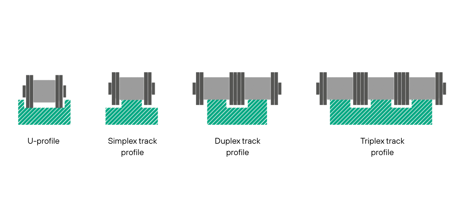 Roller chains are usually tensioned via their rollers, which is why our sliding profiles feature a guide profile. These can be manufactured for simplex, duplex, and triplex chains. For smaller chains (≤ 06B-1), there is also the option of using a U-profile.